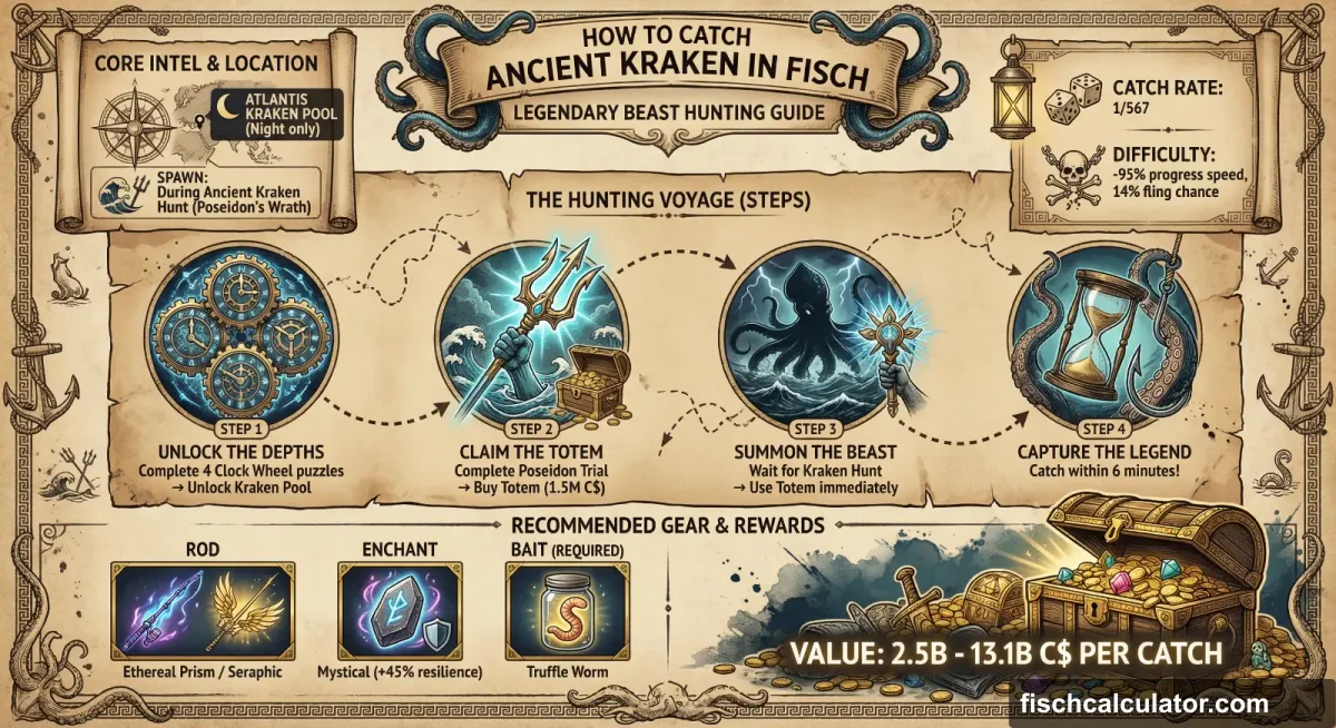 Step 1: Complete all four Clock Wheel puzzles in Atlantis to unlock the Kraken Pool. Step 2: Complete the Poseidon Trial Puzzle to access Poseidon's Room and buy the Poseidon's Wrath Totem for 1,500,000 C$. Step 3: Wait for a natural Kraken Hunt to start (announced server-wide). Step 4: Immediately use your Poseidon's Wrath Totem to transform it into an Ancient Kraken Hunt. Step 5: You have exactly 6 minutes before the hunt ends. The regular Kraken can still spawn alongside the Ancient variant, so not every catch is guaranteed to be the Ancient version.