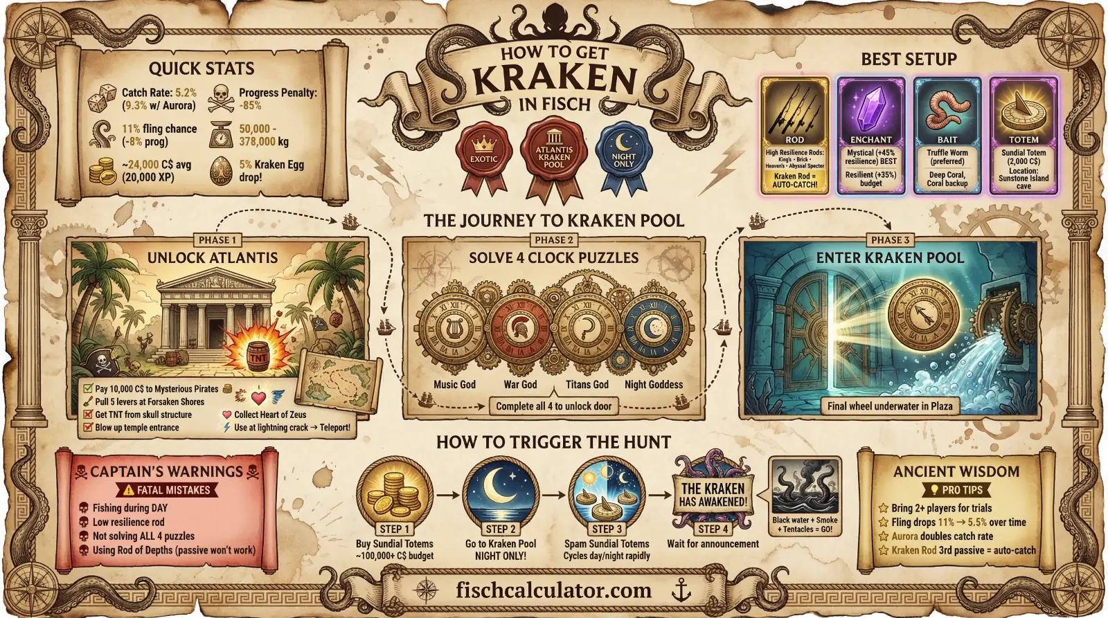 How to Get Kraken in Fisch - Complete guide showing Atlantis Kraken Pool location, 4 Clock Wheel puzzles (Lyre, Helmet, Sickle, Moon), 5.2% catch rate (9.3% with Aurora), 50,000-378,000 kg weight, -85% progress penalty, 11% fling attack, best setup with King Rod and Truffle Worm bait, 5% Kraken Egg drop